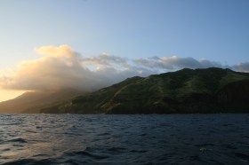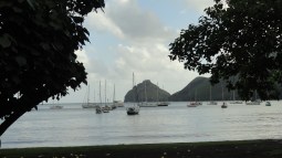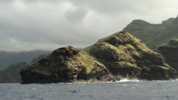 sail in. The trip was very enjoyable. During the night the wind weakened and slowed our progress, which did not worry us as we had enough time to reach our destination. The bay that we anchored into in the early hours of the morning are the remnants of a volcano crater whose peaks and slopes overgrown with mimosa trees and other exotic herbs just blend in with the Pacific Ocean. In a word, a great and very well protected anchorage. With an extraordinary mood, we