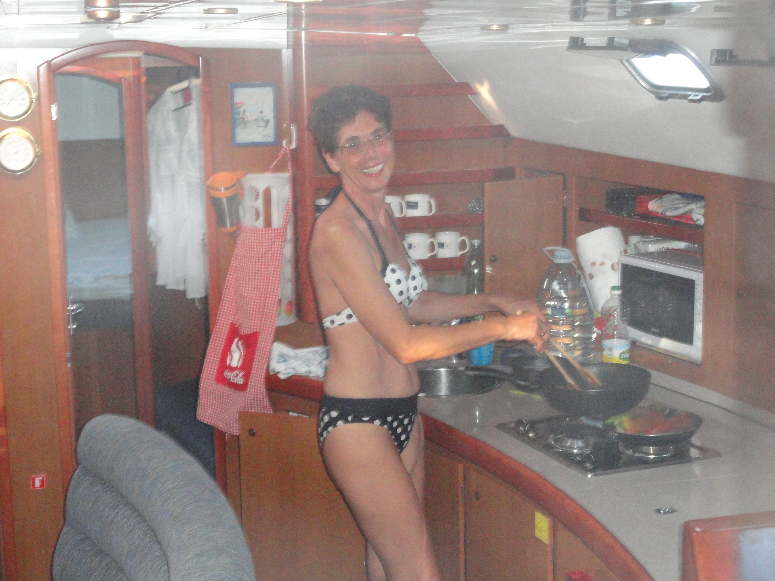 dva tjedna iskoristili za ugradnju tanguna, još jednog buma za pramčano jedro, izmjenu ležajeva na oba kormila koja su u potpunosti propala i provjeru svih važnih tačaka na brodu. Kreiranje menua i priprema obroka za mjesec dana putovanja činilo mi je posebno zadovoljstvo. Uživala sam gledati Petera kako se uživio u cijelu situaciju. Naprosto je blistao od sreće i zadovoljstva. Vanja i Mani su također bili okupirani poslom dok su Bondovu pažnju zaokupile ribe na koje se posebno oblizivao. Pomagali smo jedni drugima kad je trebalo tim više sto je Vanja isplovio za Mindelo tjedan dana prije. Finale Svjetskog Prvenstva u Ragbiju, koje se održavalo krajem Oktobra, donijelo