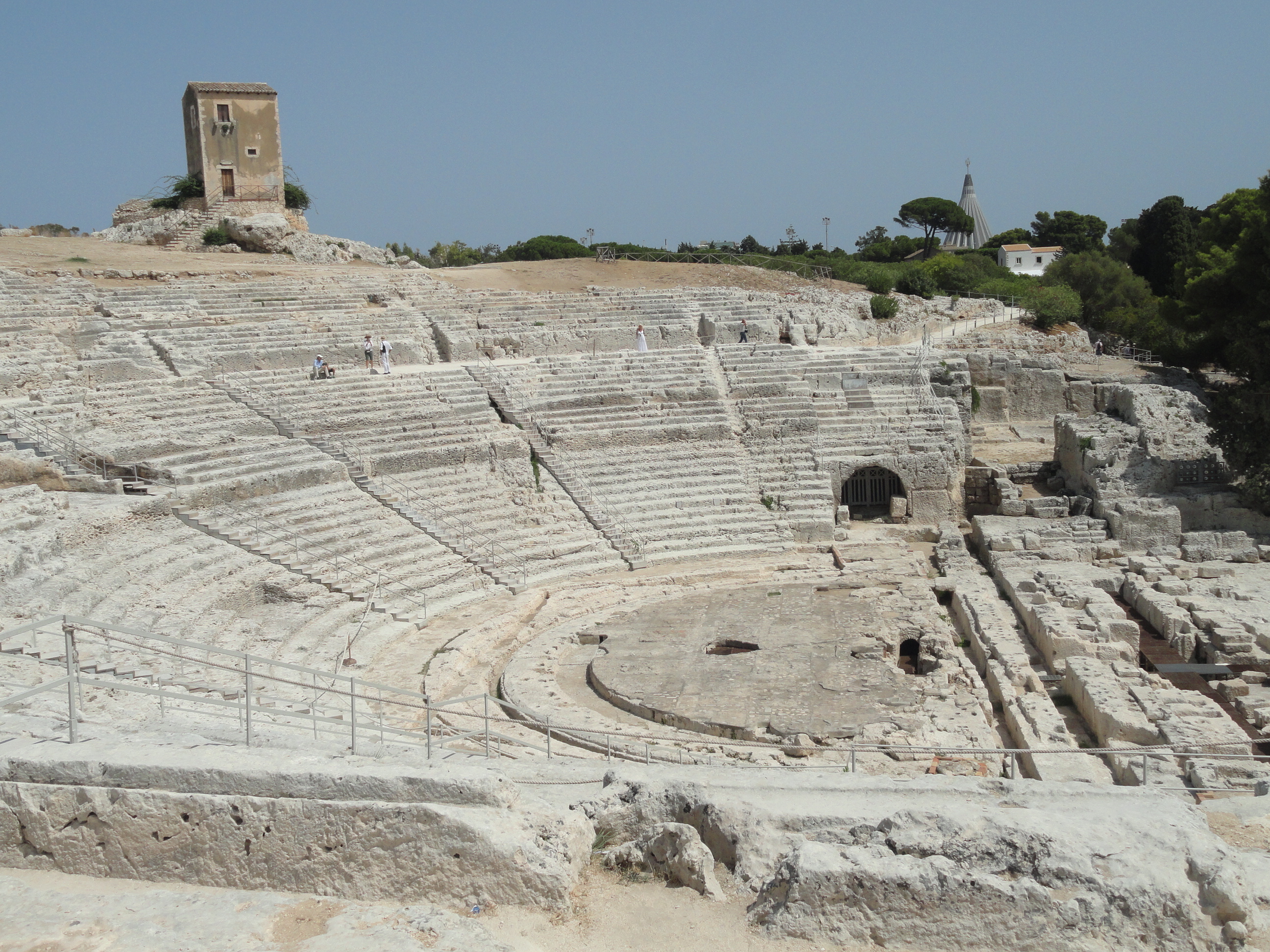 Greeco Theatro nalazi se na brdu Temenite, s kojeg se pruža predivan pogled na grad Syracusu. Stojeci na bijelim kamenim stepenicama doimalo se da starogrcka scena oživljava. Sagrađen je oko 500 godine prije Krista kapaciteta od 15.000 gledatelja i promjera 140 metara, sto je predstavljalo najvece kazaliste u antickom svijetu. Tu su održavane
